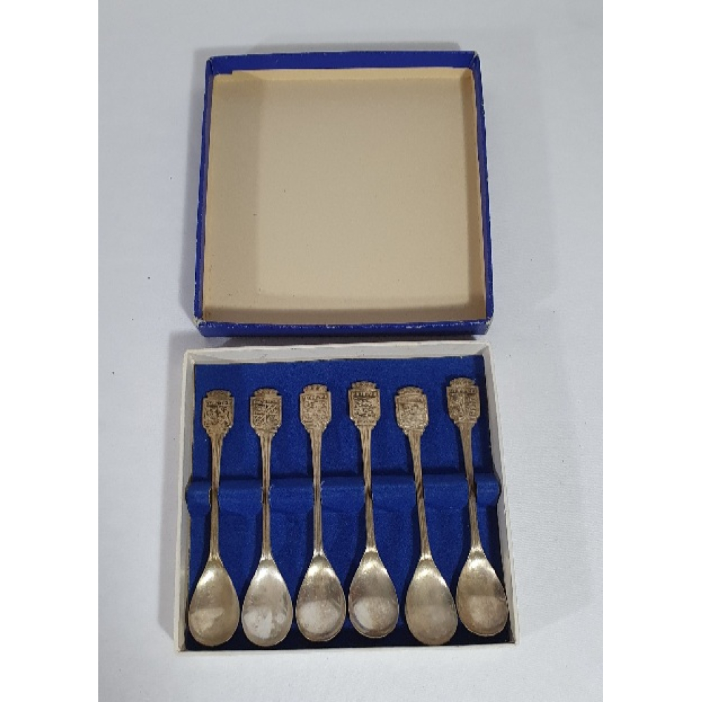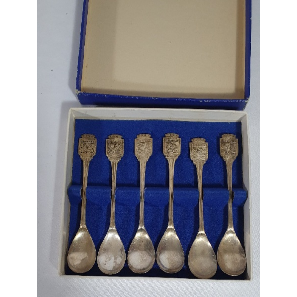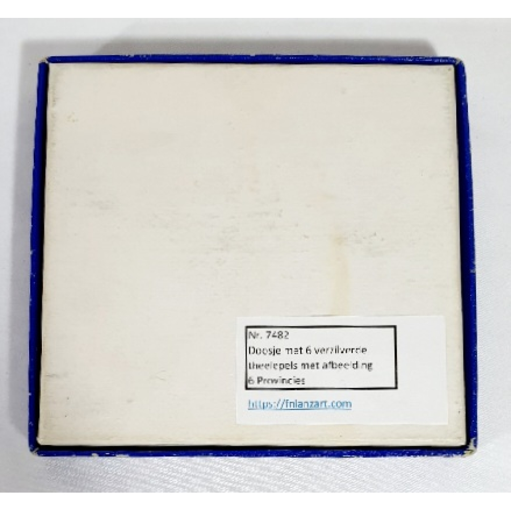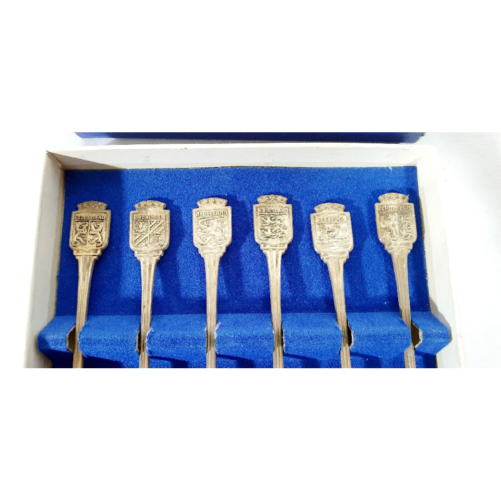 6 Verzilverde theelepels met wapens van 5 provincies en 1 van Nederland, in originele doos