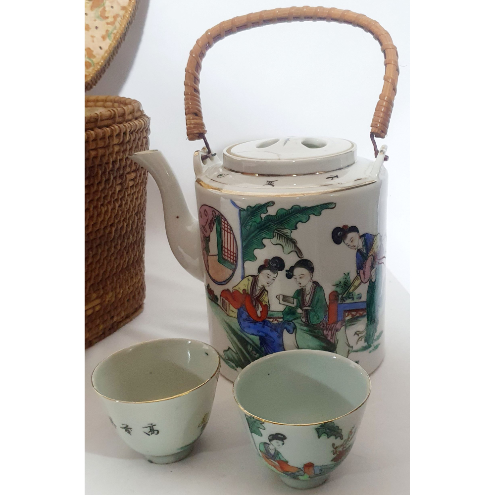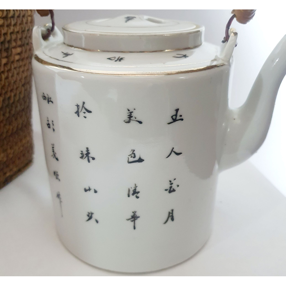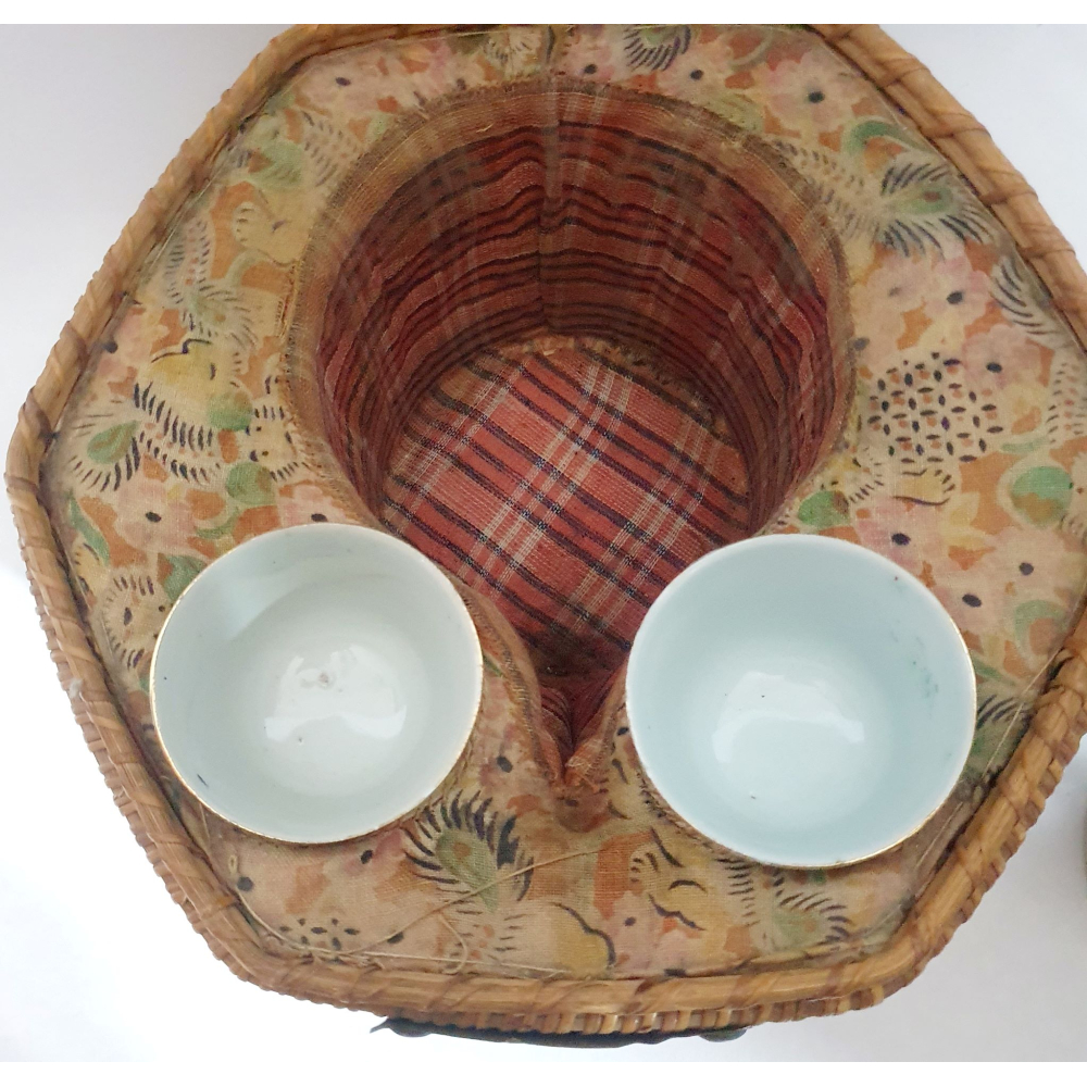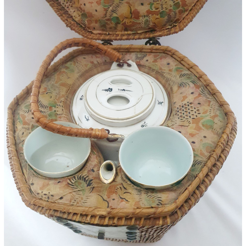 Chinees porseleinen theeset in rieten foedraal. Ca. 1900. De deksel van de theepot is beschadigd.