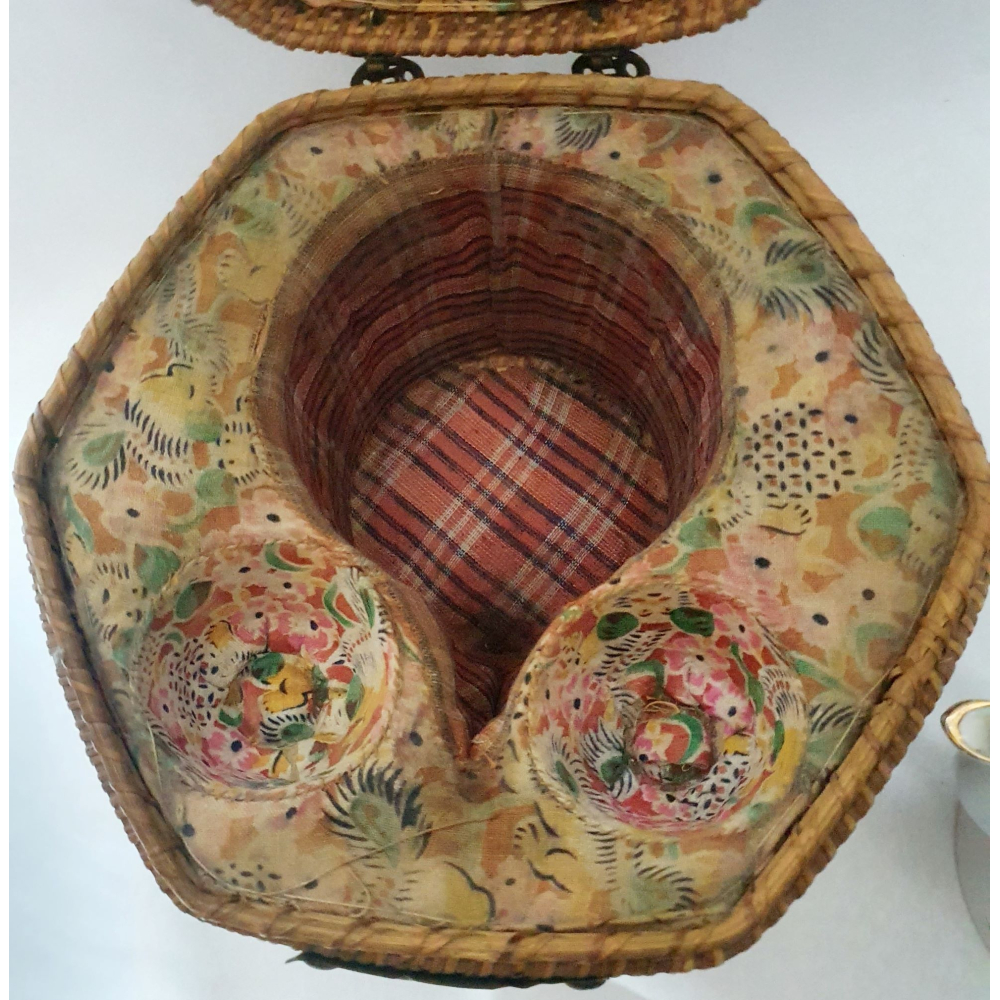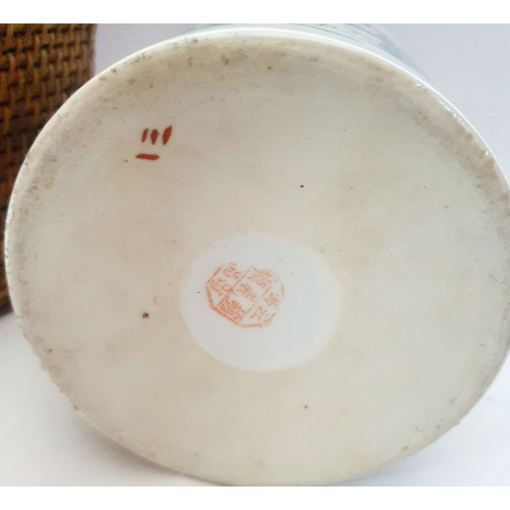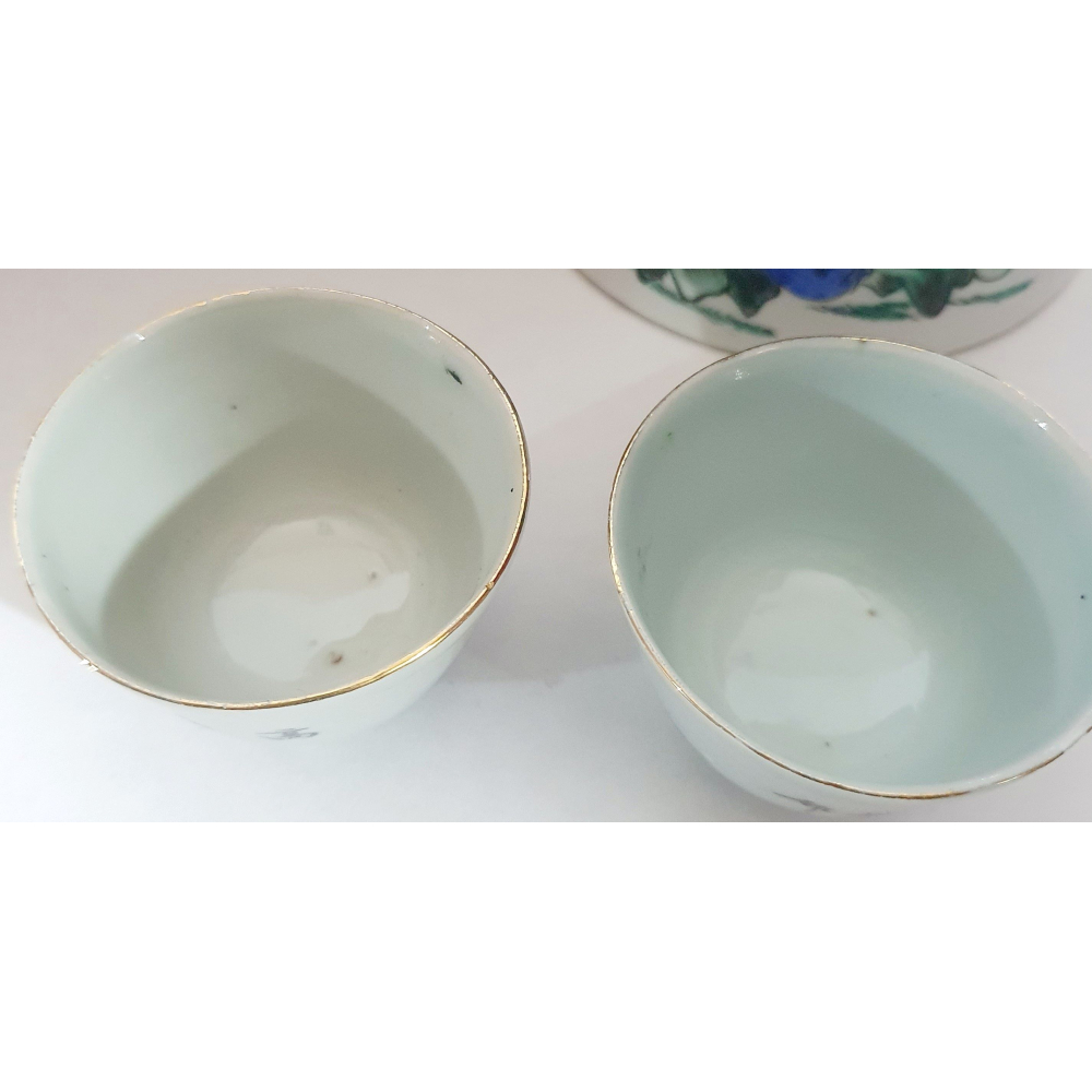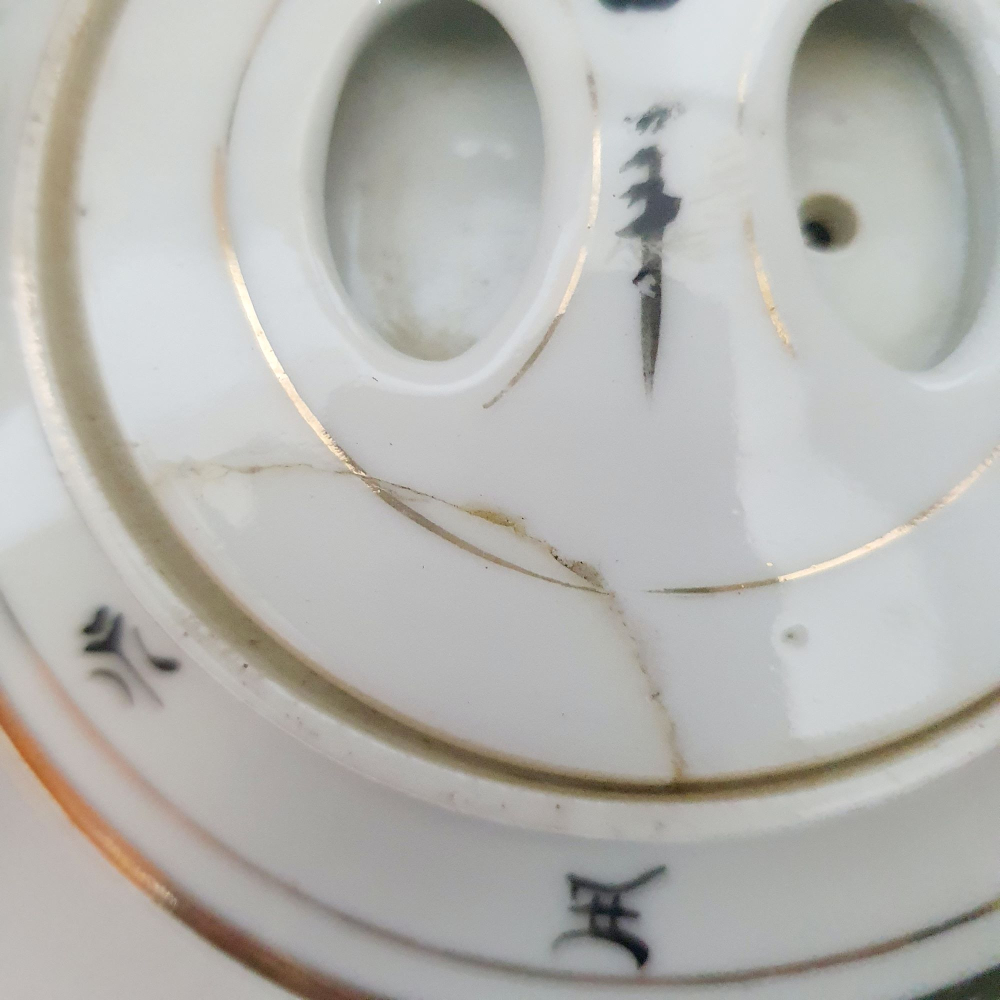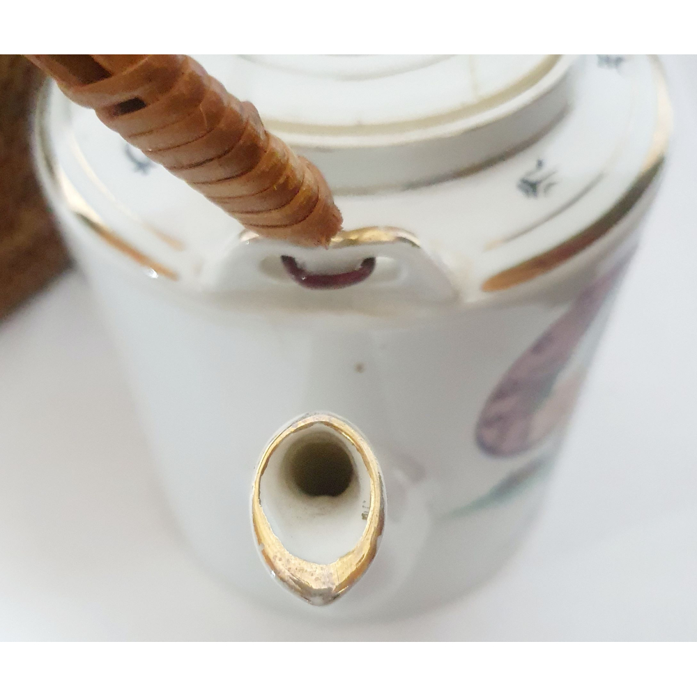Chinees porseleinen theeset in rieten foedraal. Ca. 1900. De deksel van de theepot is beschadigd.