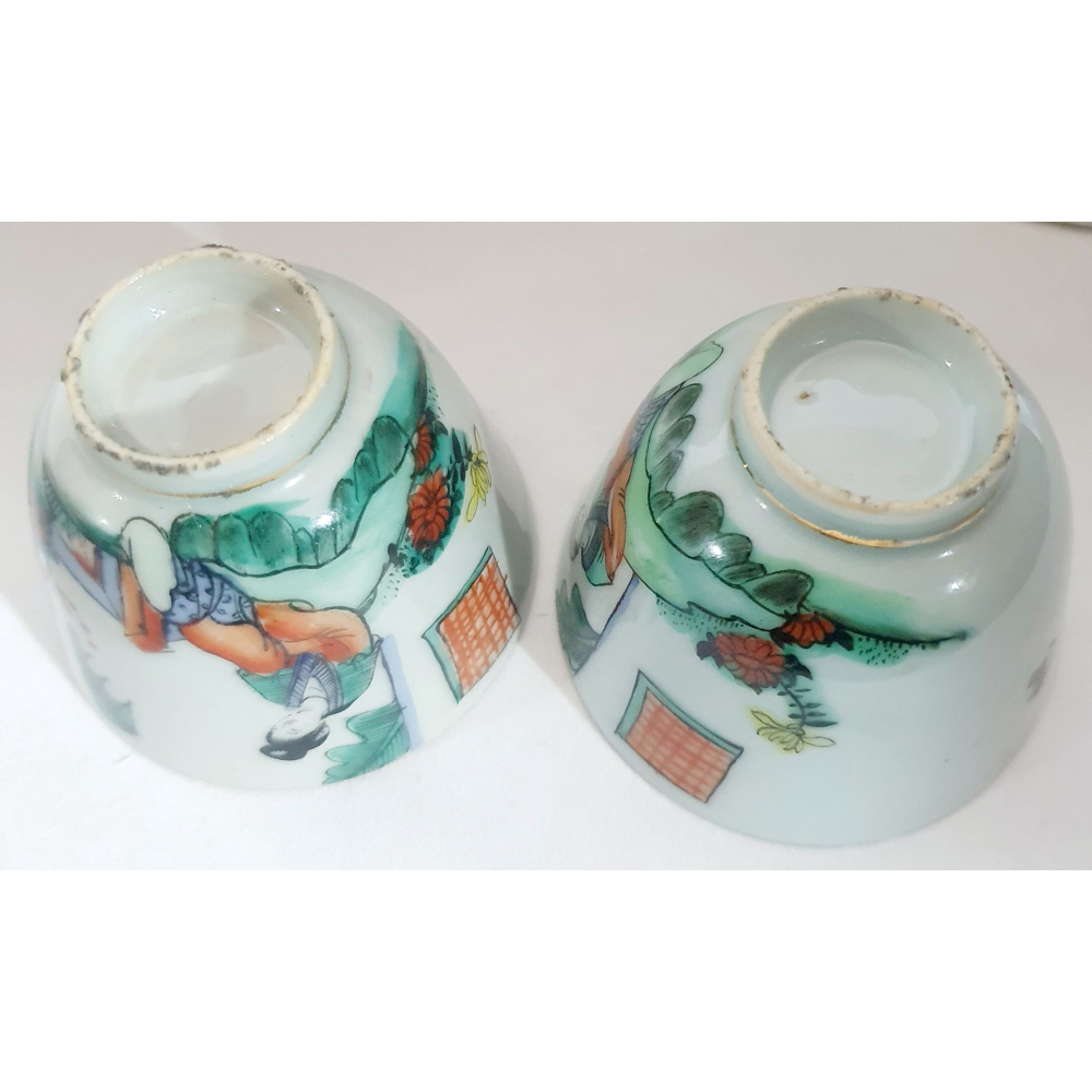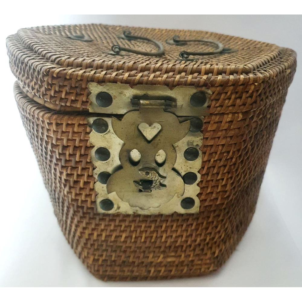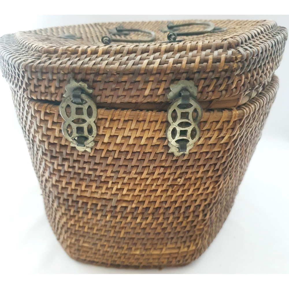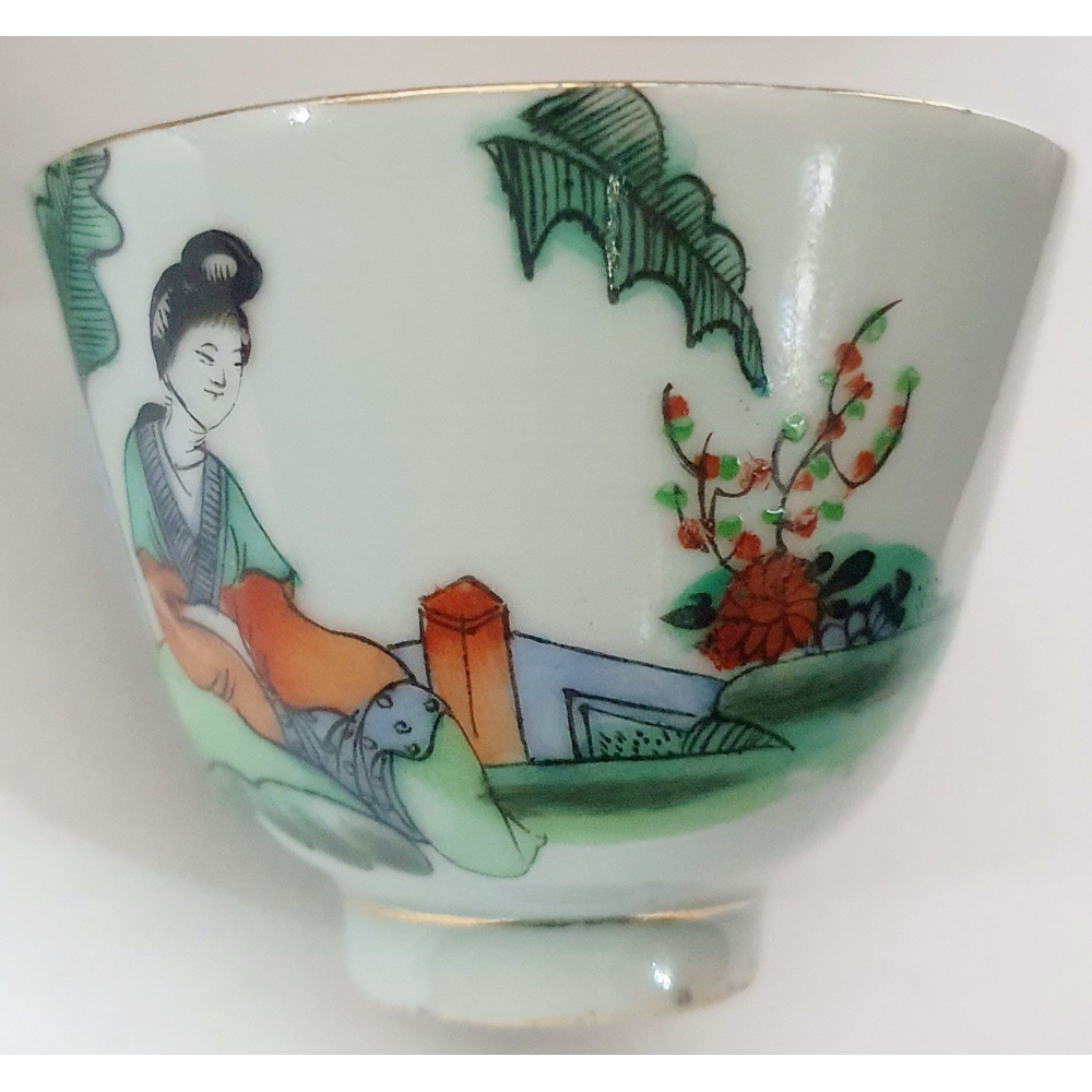 Chinees porseleinen theeset in rieten foedraal. Ca. 1900. De deksel van de theepot is beschadigd.