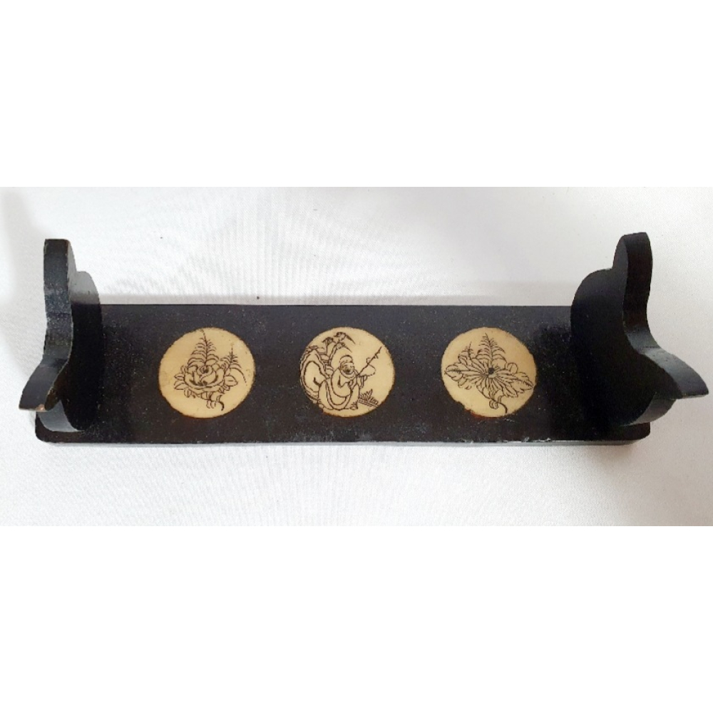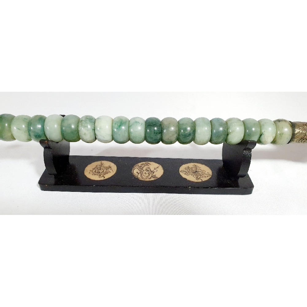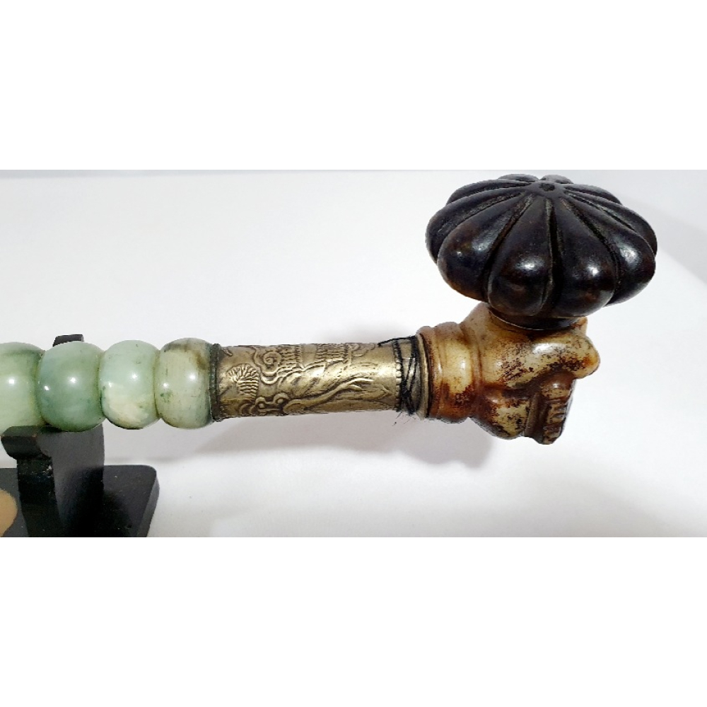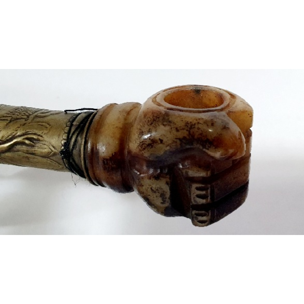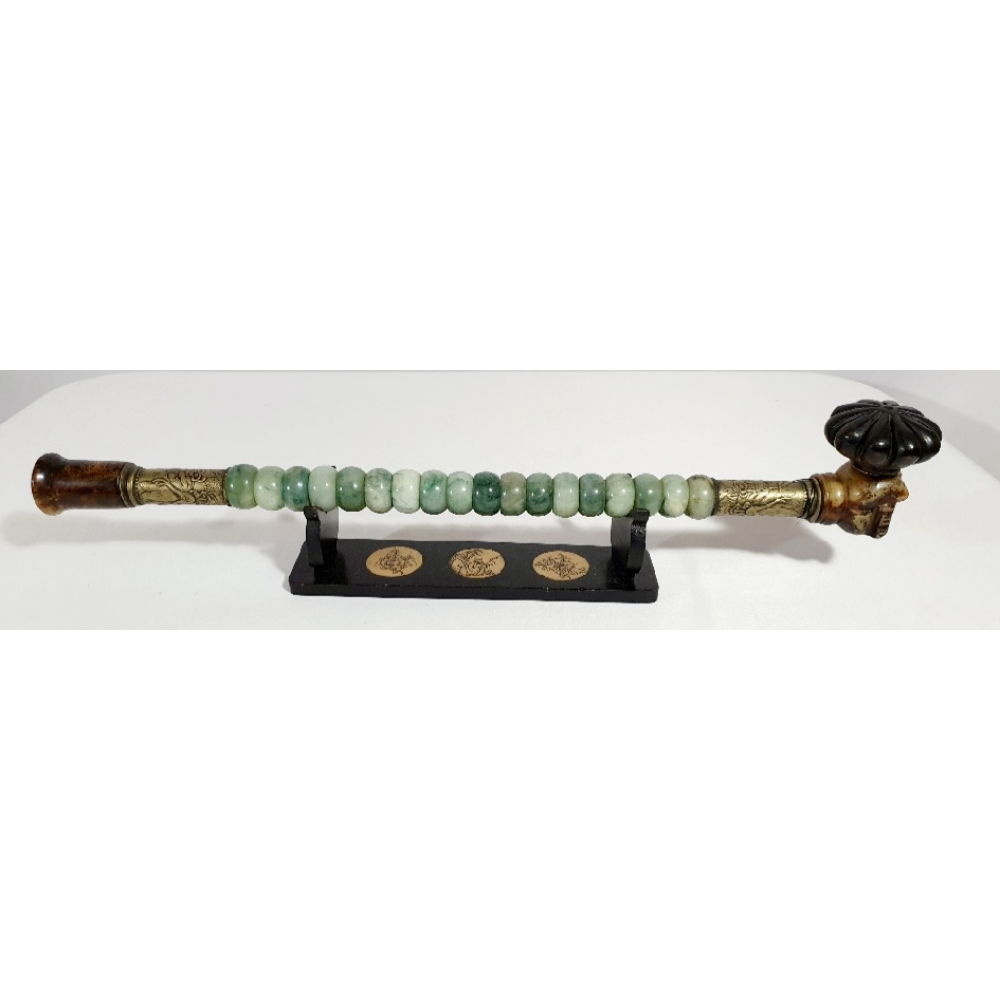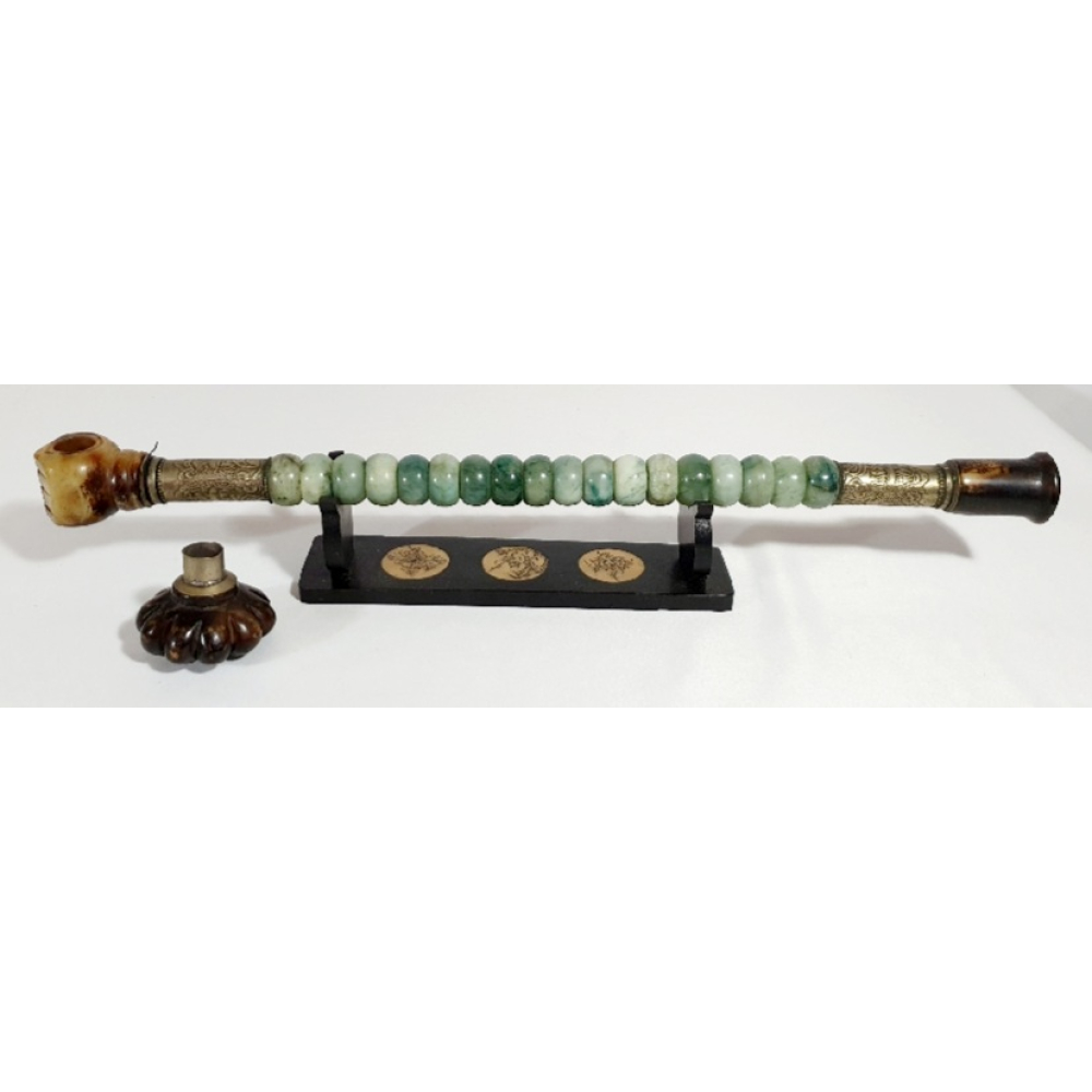 Chinese opiumpijp met nefriet (jade) en koper op standaard. 20e eeuw