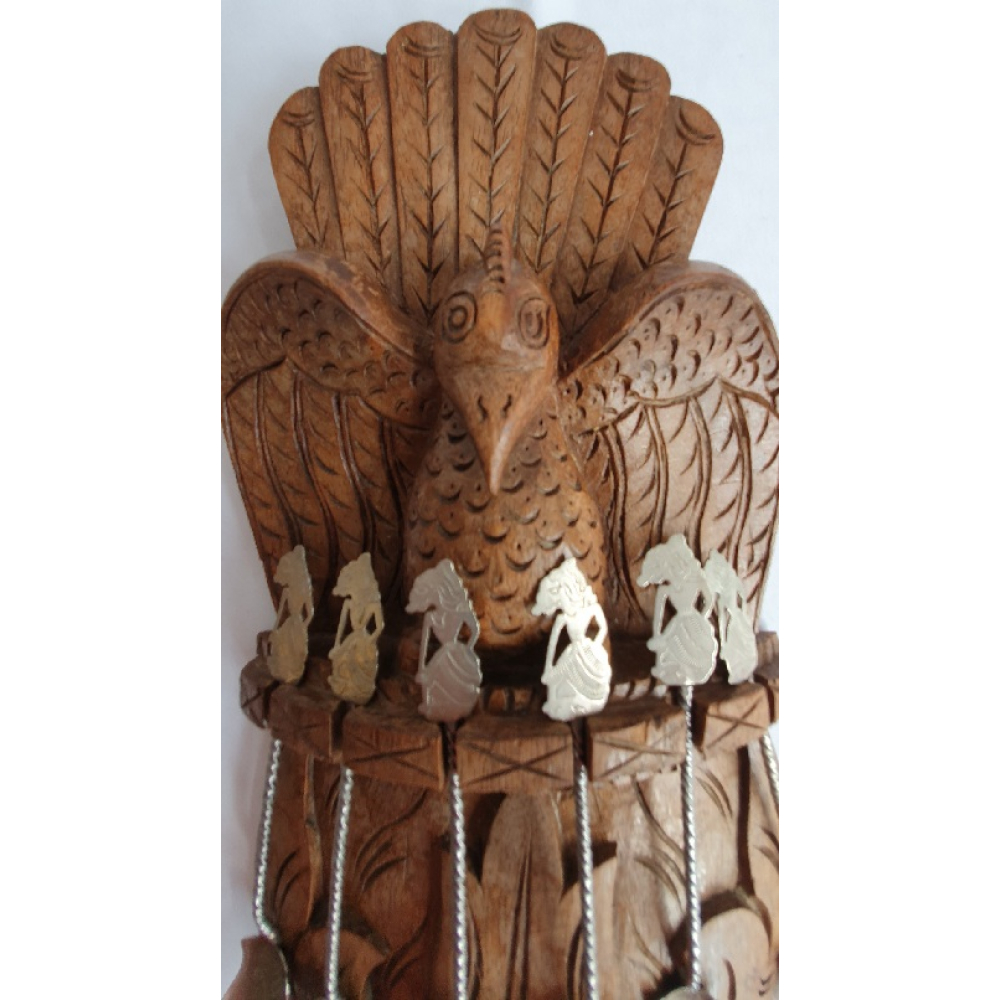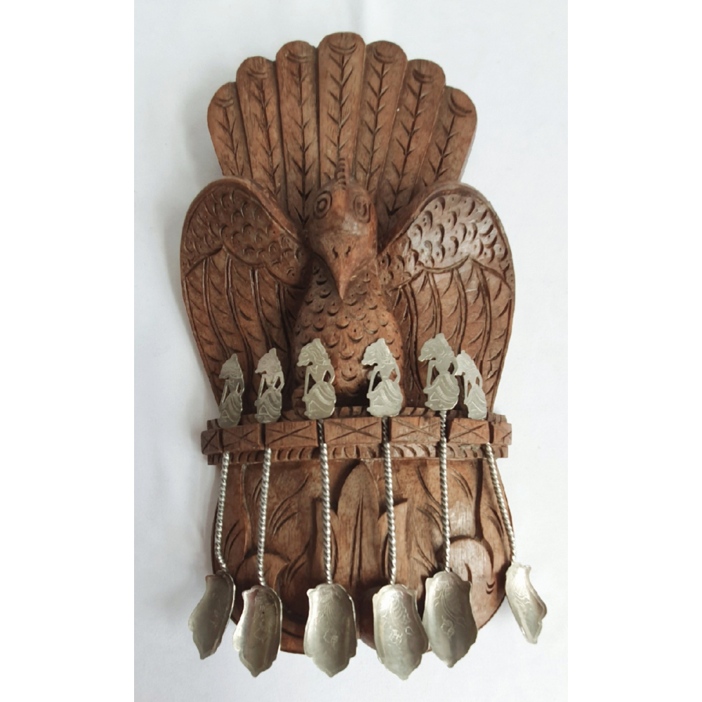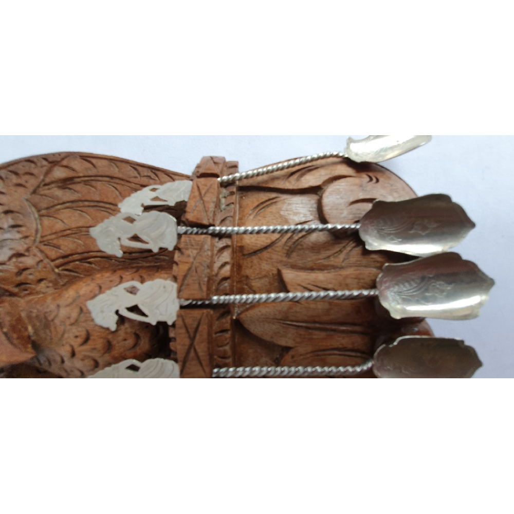 Indonesisch hardhouten lepelrek met 6 Wayang theelepels