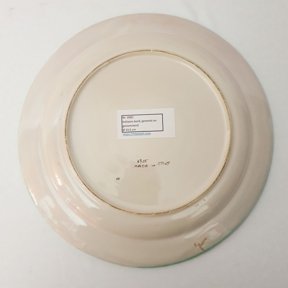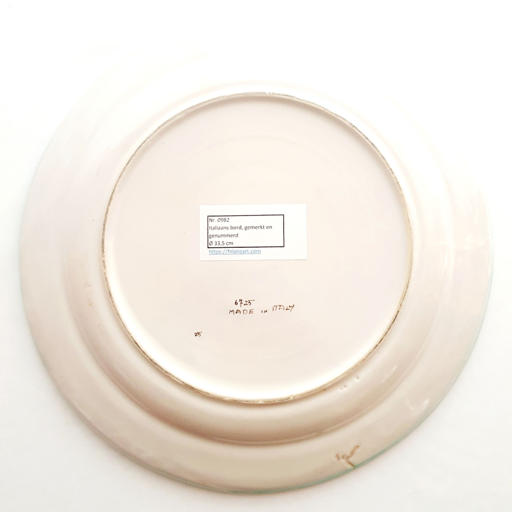Italiaans bord, gemerkt en genummerd. Doorsnede 33.5 cm