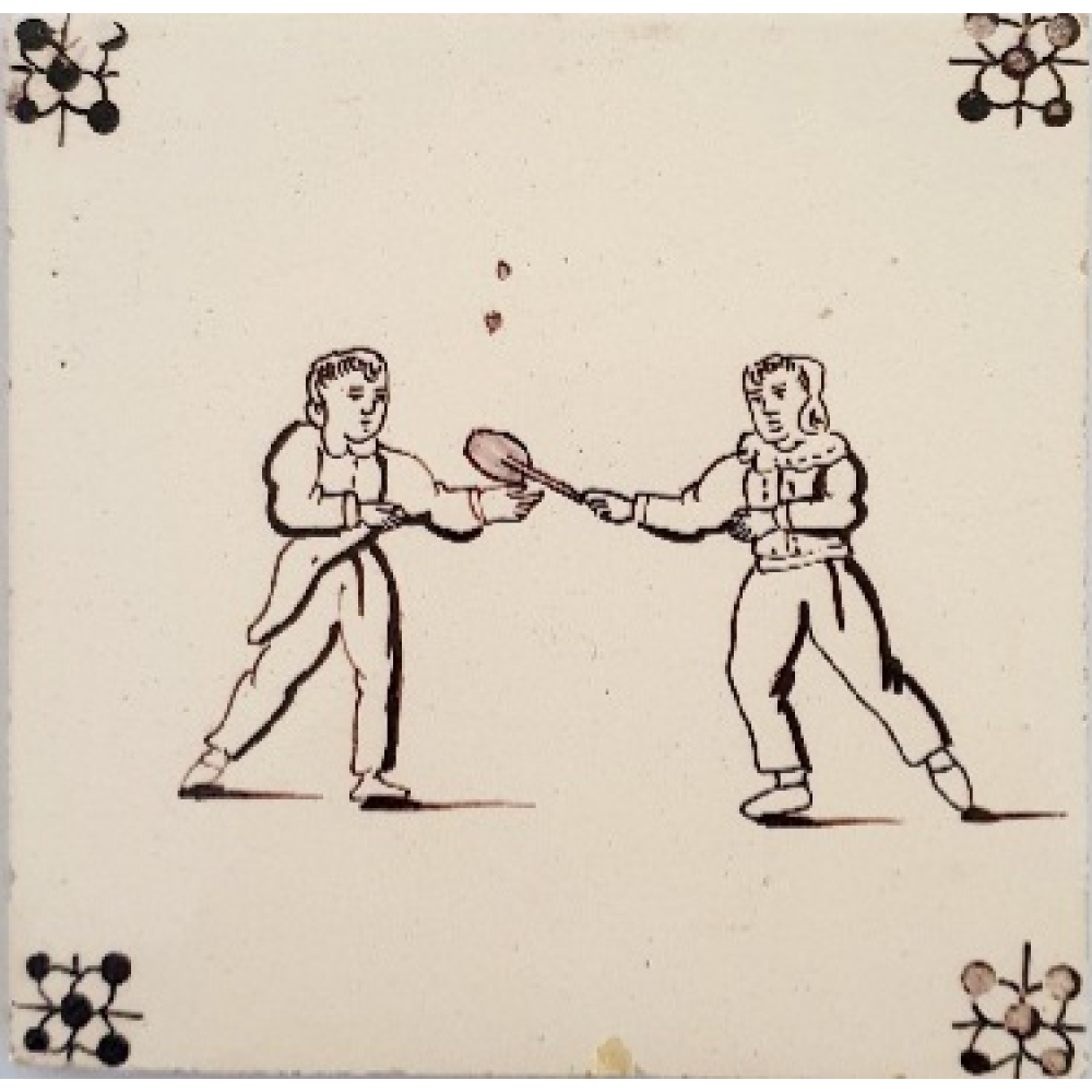 Leuke oud Hollandse tegel met afbeelding 2 spelende kinderen. Bruin-wit.