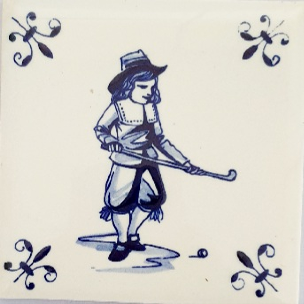 Leuke oud Hollandse tegel met afbeelding golfer. Blauw-wit.